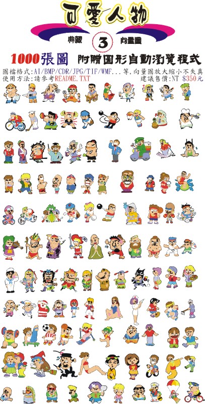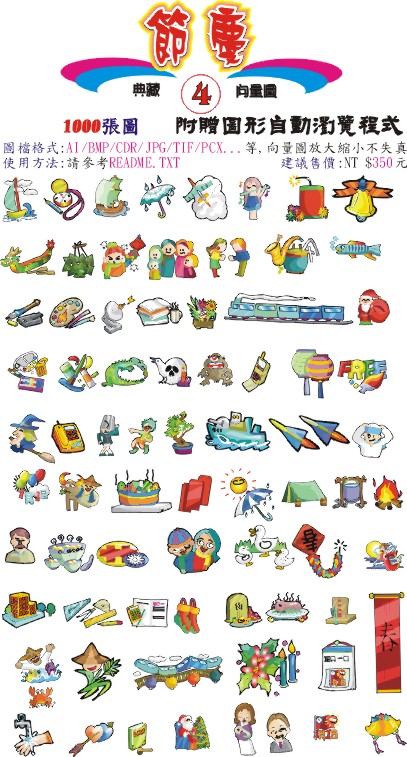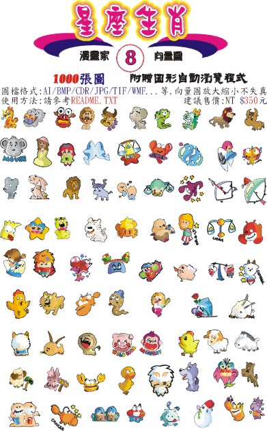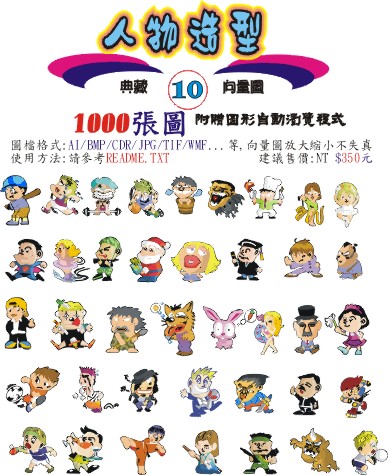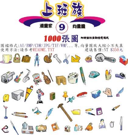 包括: 人物造型、上班族、水果植物、可愛人物、可愛俏皮、生活用品、交通工具、星座生肖、節慶、頑皮動物等十張光碟,每張光碟依屬性搜集了各1000張向量圖檔,值得您的珍藏.