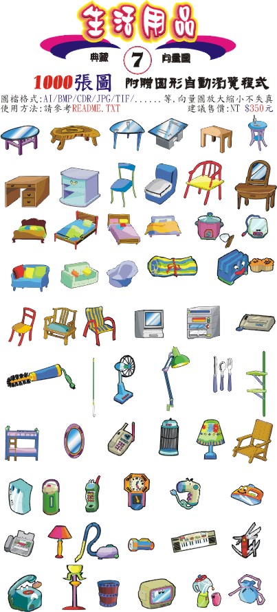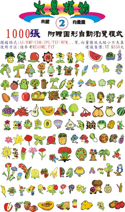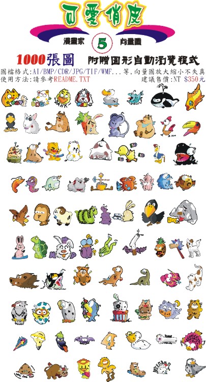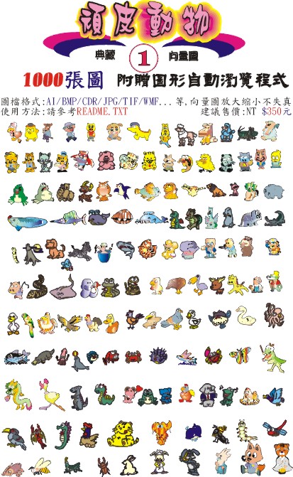 內含1000張向量圖檔,每一個圖檔皆存成以下圖檔格式:AI/BMP/CDR/JPG/TIF/WMF...等,