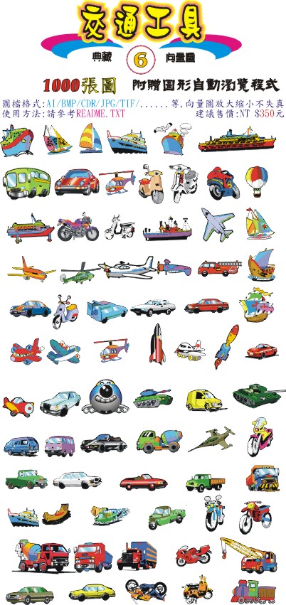 內含十張光碟,共10000張向量圖檔,每一個圖檔皆存成以下圖檔格式:AI/BMP/CDR/JPG/TIF/WMF...等.