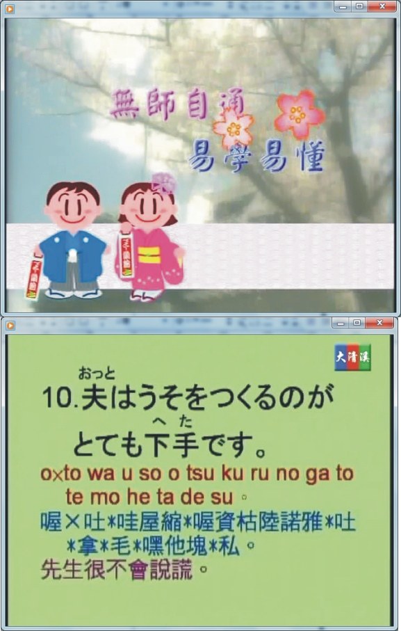 產品介紹: 想學日語嗎?學會日語句子文章輕輕鬆鬆,全台唯一互動式日語教學,中、日老師真人教導,逐字學習,聽、說、讀、寫反覆練習,平假名、片假名、羅馬拼音、中文拼音、詞類變化,內附教學課本,讓您輕鬆學會高級日語.