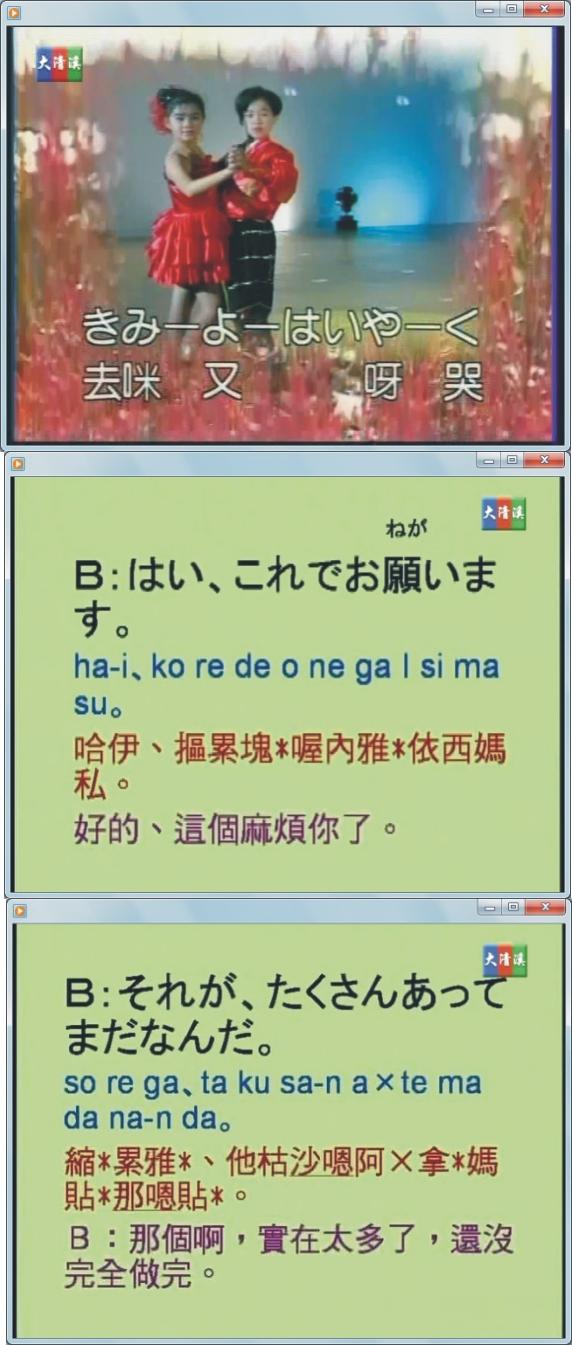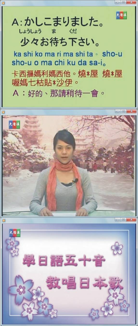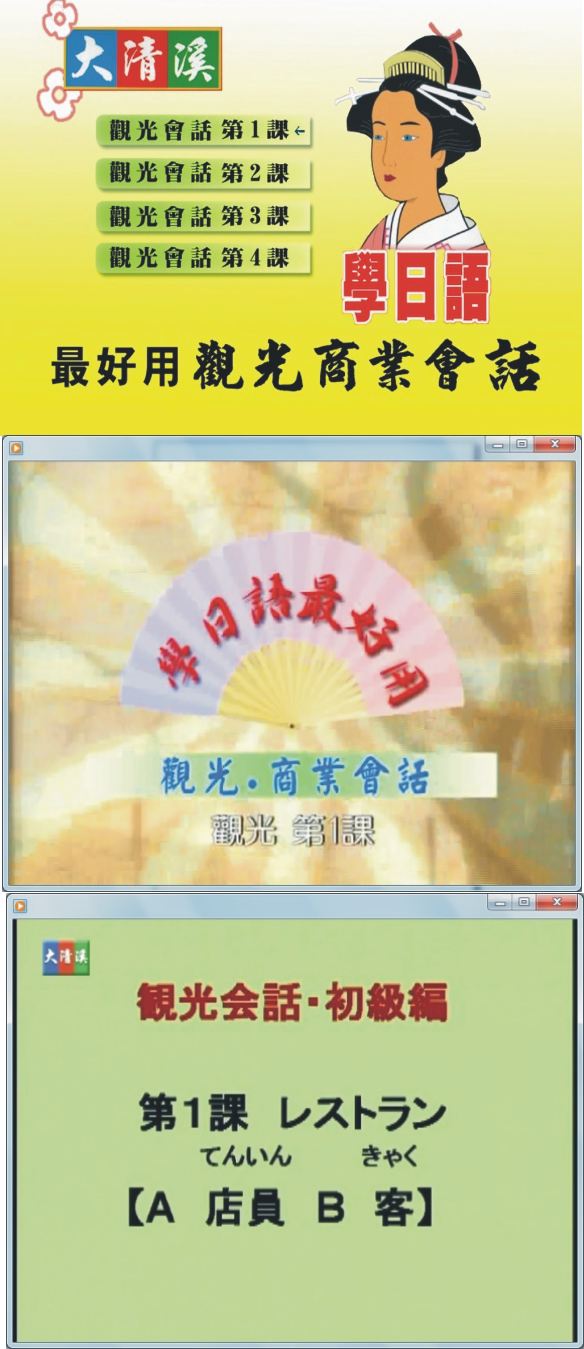 三片DVD光碟,共12小時,分成12課: 1---日式餐廳、小酒館點酒點餐使用語. 2---購買衣服、鞋子、土產使用語. 3---旅館住宿登記使用語,錢幣兌換使用語. 4---大眾交通工具常用語,新幹線的預約使用語. 5---主題場所、遊園地、美術館、博物館. 6---醫療機構常用語. 7---自我介紹使用語. 8---上下班時的問候語,拜訪別家公司的問候語,離開公司的問候語. 9---拜託請求許可使用語. 10--邀約及接待使用語,勸誘、接受、婉拒使用語. 11--電話轉接留言使用語,回電及重撥使用語,電話禮儀使用語. 12--預約、申請、建議、提案使用語.
