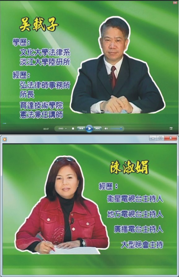 三片DVD光碟,共12小時,分成12課: 1---收到法院傳票、通知書、判決書等,第一時間要如何處理? 2---理財不當,刷卡刷爆了,欠錢被討債,卡奴該如何是好? 3---民間互助會應注意的事項,倒會該如何處理? 4---有關房屋買賣,法拍屋、預售屋、兇宅,租賃特別應注意事項,收不到租金,或房客不肯搬離,該怎麼辦? 5---有關結婚、離婚、收養、認領、監護權、贍養費應注意的事項. 6---有關發生車禍案件處理的注意事項,理賠車損保險,損害求償. 7---有關身份證(正、影本)使用的注意事項,有關票據(本票、支票)的相關法律,遺失、申請、提存、侵占? 8---什麼情況下最好要請律師?解決法律問題的三個步驟? 9---被警察或調查局約談時,做筆錄要注意哪些權利? 10--有關各種合解書、切結書、承諾書、合約書、協議書、存證信函的法律. 11--夫妻吵架、家庭糾紛、家庭暴力應如何處理? 12--有關遺囑的各種寫法,遺產繼承的相關法律,如何善用各鄉鎮調解委員會?