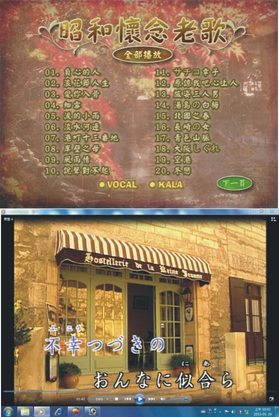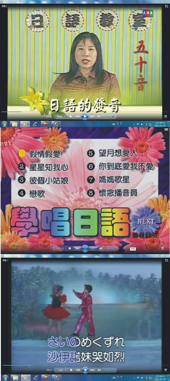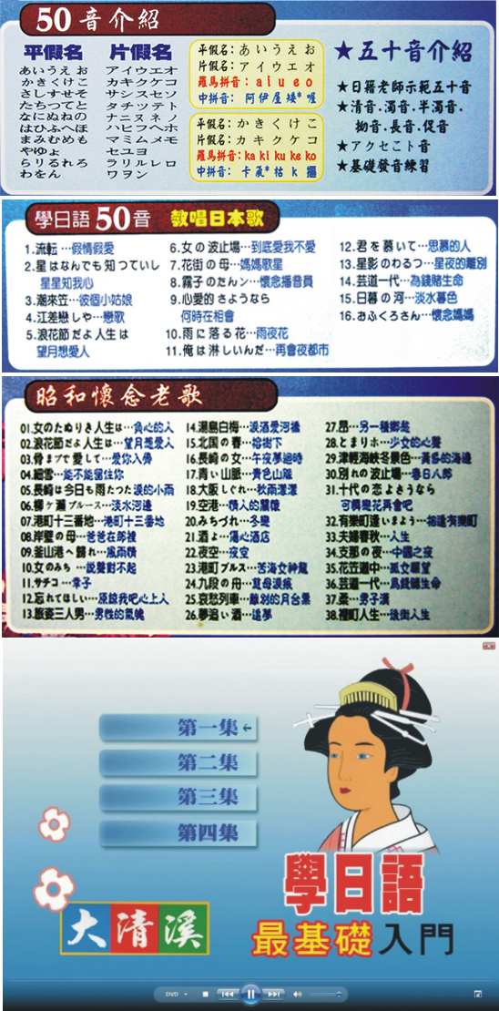 三片DVD光碟,分成50音介紹、教唱日本歌、昭和懷念老歌.