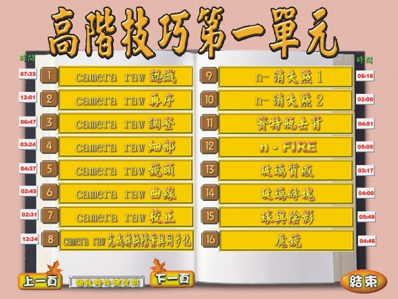 課程單元: 1.Camera Raw 認識 2.Camera Raw 再序 3.Camera Raw 調整 4.Camera Raw 細部 5.Camera Raw 鏡頭 6.Camera Raw 曲線 7.Camera Raw 校正 8.Camera Raw 完成轉換檔案與同步化 9.消失點1 10.消失點2 11.寶特瓶去背 12.n-fire 13.玻璃質感 14.玻璃磚塊 15.求與陰影 16.魔鏡 17.3D立體字 18.光芒 19.相片變水墨畫 20.突顯相片風格 21.環環相扣 22.鏡頭模糊 23.曲線法