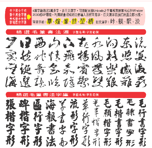 - 五萬多個 True Type向量毛筆書法字源以及16套True Type向量字庫,共包含了東晉、唐、齊、明、元、 南朝宋、梁、金、隋、吳、中華民國等各朝代共百餘位書法名家真跡。