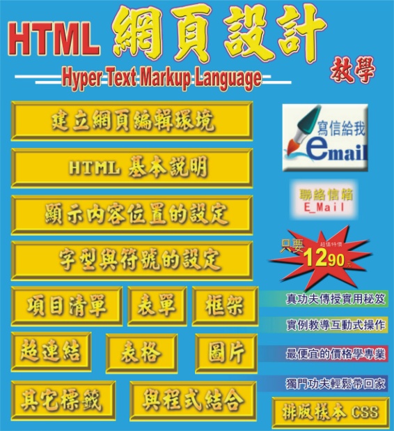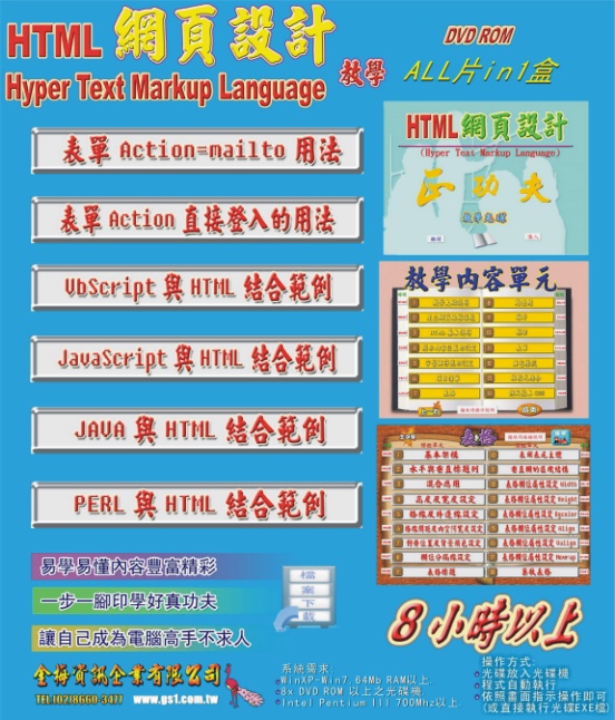 共13章節,從架構Dreamweaver編寫環境,接著介紹網頁標籤的用法,進而以實際範例介紹如何與其它程式的結合, 不但可以學會網頁設計基礎,更可以接觸VB Script,Java Script,JAVA,PERL等程式語言之安裝及使用範例說明,真正讓您學會網頁設計的技巧. 000_HTML網頁設計教學 001_建立網頁編輯環境 1.建立網頁編輯環境示意圖說明 2.用什麼軟體來編寫網頁程式? 3.如何建立本機測試環境? 002_HTML基本說明 1.認識HTML 2.基本架構說明 3.標籤說明 4.常用標籤介紹 003_顯示內容位置的設定 1.<BR> 2.<NOBR>…</NOBR> 3.<P> 4.<P Align=”left”、”center”、”right”> 5.<CENTER> …… </CENTER> 6.<HR> 7.<HR Size=”?”> 8.<HR Width=”?”> 9.<HR Align=”?”> 10.<HR NoShade> 11.<PRE> …… </PRE> 12.<DIV Align=”?”>內容</DIV> ?= left , center , right 13.<BLOCKQUOTE> …… </BLOCKQUOTE > 14.<ADDRESS> …… </ADDRESS > 004_字型與符號的設定 1.<H?> …… </H?> => ?=1~6 2.<H? Align=left、center、right>……</H?> 3.<FONT Size=”?” Color=”顏色”>……</FONT> 4.<BASEFONT Size=”?”> ?=1~7 5.<EM>…</EM> 斜體字 <VAR>…</VAR> 斜體字 <CITE>…</CITE> 斜體字 <STRONG>…</STRONG> 粗體字 <CODE>…</CODE> 細體字 <DFN>…</DFN> 標準字 <SMALL>…</SMALL> 小字體 <BIG>…</BIG> 大字體 6.<B>…</B> 粗體字 <I>…</I> 斜體字 <U>…</U> 加底線 <S>…</S> 加刪除線 <TT>…</TT> 細小字 <SUP>…</SUP> 上標字 <SUB>…</SUB> 下標字 7.<FONT Face=”金梅毛行書” Size=”?” Color=”顏色”>…</FONT> 8.符號說明: < 說明:瀏覽器解讀為 < < 說明:瀏覽器解讀為 < > 說明:瀏覽器解讀為 > > 說明:瀏覽器解讀為 > & 說明:瀏覽器解讀為 & & 說明:瀏覽器解讀為 & 說明:瀏覽器解讀為空格,可連續 只能空1格無法連續   只能空1格無法連續 ! 說明:瀏覽器解讀為 ! " 說明:瀏覽器解讀為 “ " 說明:瀏覽器解讀為 “ # 說明:瀏覽器解讀為 # $ 說明:瀏覽器解讀為 $ % 說明:瀏覽器解讀為 % ' 說明:瀏覽器解讀為 ‘ ( 說明:瀏覽器解讀為 ( ) 說明:瀏覽器解讀為 ) * 說明:瀏覽器解讀為 * + 說明:瀏覽器解讀為 + , 說明:瀏覽器解讀為 , - 說明:瀏覽器解讀為 - . 說明:瀏覽器解讀為 . / 說明:瀏覽器解讀為 / 0~ 9 說明:瀏覽器解讀為 0~9 : 說明:瀏覽器解讀為 : ; 說明:瀏覽器解讀為 ; = 說明:瀏覽器解讀為 = ? 說明:瀏覽器解讀為 ? @ 說明:瀏覽器解讀為 @ A ~ Z 說明:瀏覽器解讀為 A~ Z [ 說明:瀏覽器解讀為 [ \ 說明:瀏覽器解讀為 \ ] 說明:瀏覽器解讀為 ] ^ 說明:瀏覽器解讀為 ^ _ 說明:瀏覽器解讀為 _ ` 說明:瀏覽器解讀為 ` a ~ z 說明:瀏覽器解讀為 a~ z { 說明:瀏覽器解讀為 { | 說明:瀏覽器解讀為 | } 說明:瀏覽器解讀為 } ~ 說明:瀏覽器解讀為 ~ 9.字型組合應用 005_項目清單 一. 無序號的條列式清單. 二. 有序號的條列式清單. 三. 敘述式清單. 006_表格 一. 表格的基本架構: 二. 水平標題列與垂直標題列: 三. 欄位合併: 四. 表格屬性: 五. 表格標題: 六. 表格區塊結構: 七. 表格欄位屬性設定: 八. 巢狀表格: 007_超連結 一. 文字超連結: 二. 圖形超連結: 三. 關鍵字索引: 四. 超連結之顏色設定: 五. 超連結之資料傳遞: 008_圖片 一.設定圖片預設的文字: 二.設定圖片的高度及寬度: 三.設定圖片外框的寬度: 四.設定背景圖片: 五.文字與圖片的排列: 六.地圖索引: 009_框架 一.框架的基本概念: 二.框架的程式寫法: 三.框架之屬性設定說明: 四.框架之應用: 五.另一種框架表示法:(單框架) 六.超連結之Target設定值說明: 010表單 一.文字表單: 二.按鈕表單: 三.密碼表單: 四.隱藏式欄位表單: 五.單一選項表單: 六.多重選項表單: 七.圖片表單: 八.下拉式表單: 九.本文區塊表單: 十.圖像按鈕表單: 十一.標題與外框式表單: 十二.表單與程式結合: 十三.表單特殊情況: 011_其它標籤說明 一.META標籤的用法: 二.設定背景音樂: 三.播放音樂或影片: 四.電子看板: 012_與程式結合 一.表單Action=mailto…用法: 二.表單Action=直接登入的用法: 三.Vb Script與HTML結合範例: 四.Javascript與HTML結合範例: 五.JAVA與HTML結合範例: 六.PERL與HTML結合範例: 013_排版樣本 1.排版樣本: 1.行內(Inline Style)排版樣本. 2.內嵌式(Embedding Style Sheet) 3.連結式(Linking Style Sheet) 2.串接式排版樣本:CSS 3.優先順序說明